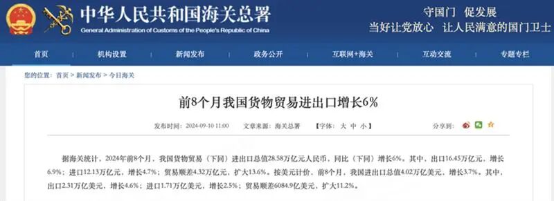2022年,面对世界变局加快演变、新冠疫情冲击等多重考验,在以习近平同志为核心的党中央坚强领导下,各地区各部门高效统筹疫情防控和经济社会发展,加大宏观调控力度应对超预期因素冲击,全年工业生产总体稳定,新动能继续成长,为保持经济社会大局稳定提供了坚实保障。海关总署10日发布数据显示,2024年前8个月,我国货物贸易进出口总值28.58万亿元人民币,同比增长6%。其中,出口16.45万亿元,增长6.9%;进口12.13万亿元,增长4.7%;贸易顺差4.32万亿元,扩大13.6%。