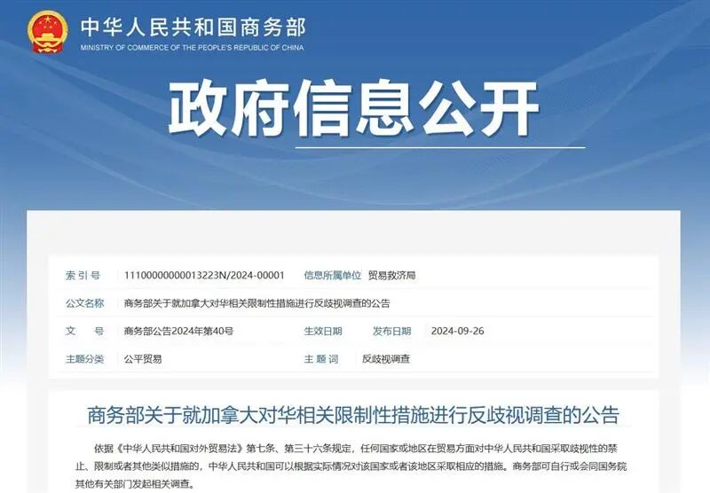 资料显示,中国商务部早在9月3日宣布将对加拿大采取的相关限制措施发起“反歧视调查”, 这是中国首次发起“反歧视调查”,也是全球首例。指向性明确,反制态度鲜明。