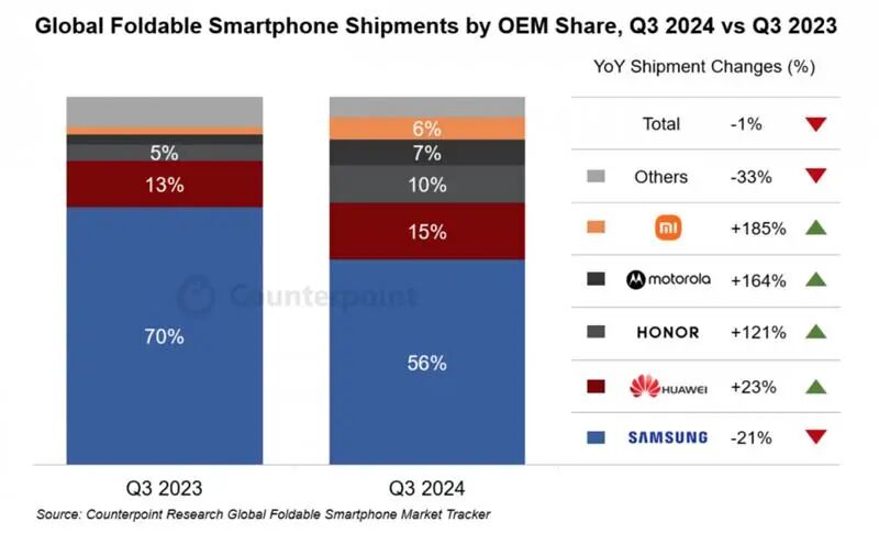 在中国市场,折叠屏手机的需求表现强劲,尽管如此,三星在中国的市场份额仅为8%,远低于其在全球其他地区的领先地位。相比之下,华为在中国市场的表现较为强劲,其出货量同比增长了23%,市场份额从13%小幅上升至15%。华为的Mate X5和Pocket 2在中国市场取得了不错的成绩,且预计即将发布的Mate X6将进一步推动华为在折叠屏市场的增长。