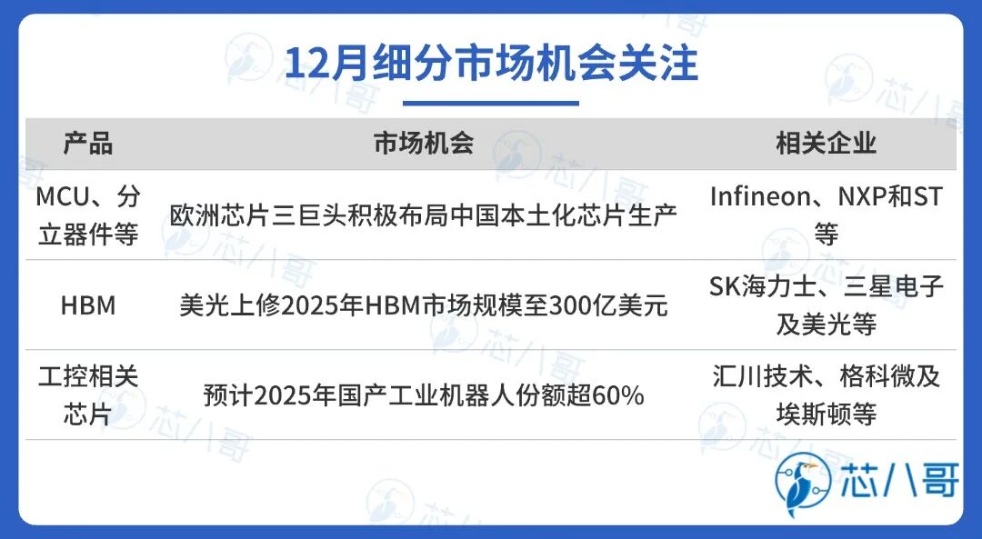从资本市场指数来看,12月费城半导体指数(SOX)和中国半导体(SW)行业指数分别下降1.5%、0.9%,显示全球半导体市场波动调整持续。